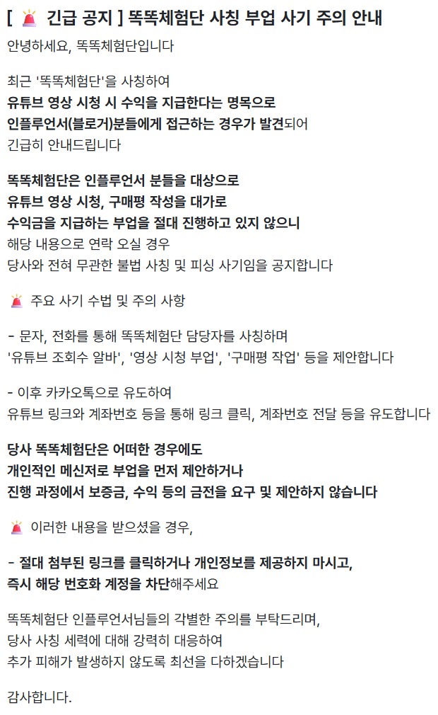 [공지] 사칭을 통한 부업 사기 조심해주세요, 똑똑체험단은 일절 그런 서비스를 하지 않습니다.
